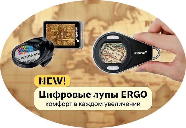 Levenhuk ERGO – цифровые лупы с переменным увеличением, предназначенные для работы с мелкими объектами и деталями. Линейка включает как компактные модели с небольшим экраном, так и профессиональные приборы с 4-дюймовым дисплеем и измерительной шкалой. Все лупы имеют регулируемое увеличение и подсветку. Помимо обычных белых светодиодов, многие модели оснащены ультрафиолетовыми источниками света. Продвинутые версии позволяют делать фото- и видеозаписи, которые сохраняются на карту памяти.