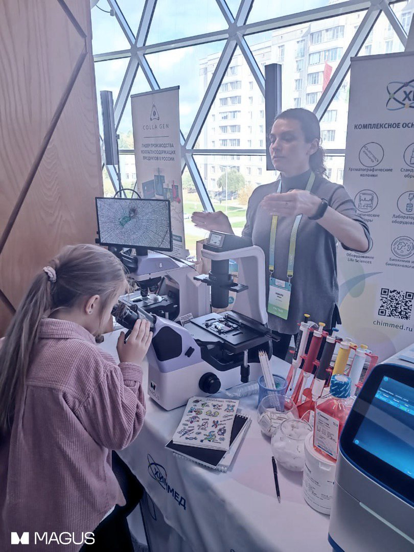 В выставке бренд MAGUS участвовал совместно с надежным партнером – компанией по продаже химических реактивов и лабораторного оборудования «Химмед». На своем стенде мы знакомили гостей мероприятия со стволовыми клетками человека – за предоставление которых благодарим Институт Цитологии и Генетики – и различными биопрепаратами на предметных стеклах. Для изучения образцов использовались оптические приборы и аксессуары MAGUS: микроскопы MAGUS Bio 270T и Bio V360, цифровая камера CHD50 и монитор MCD40.
