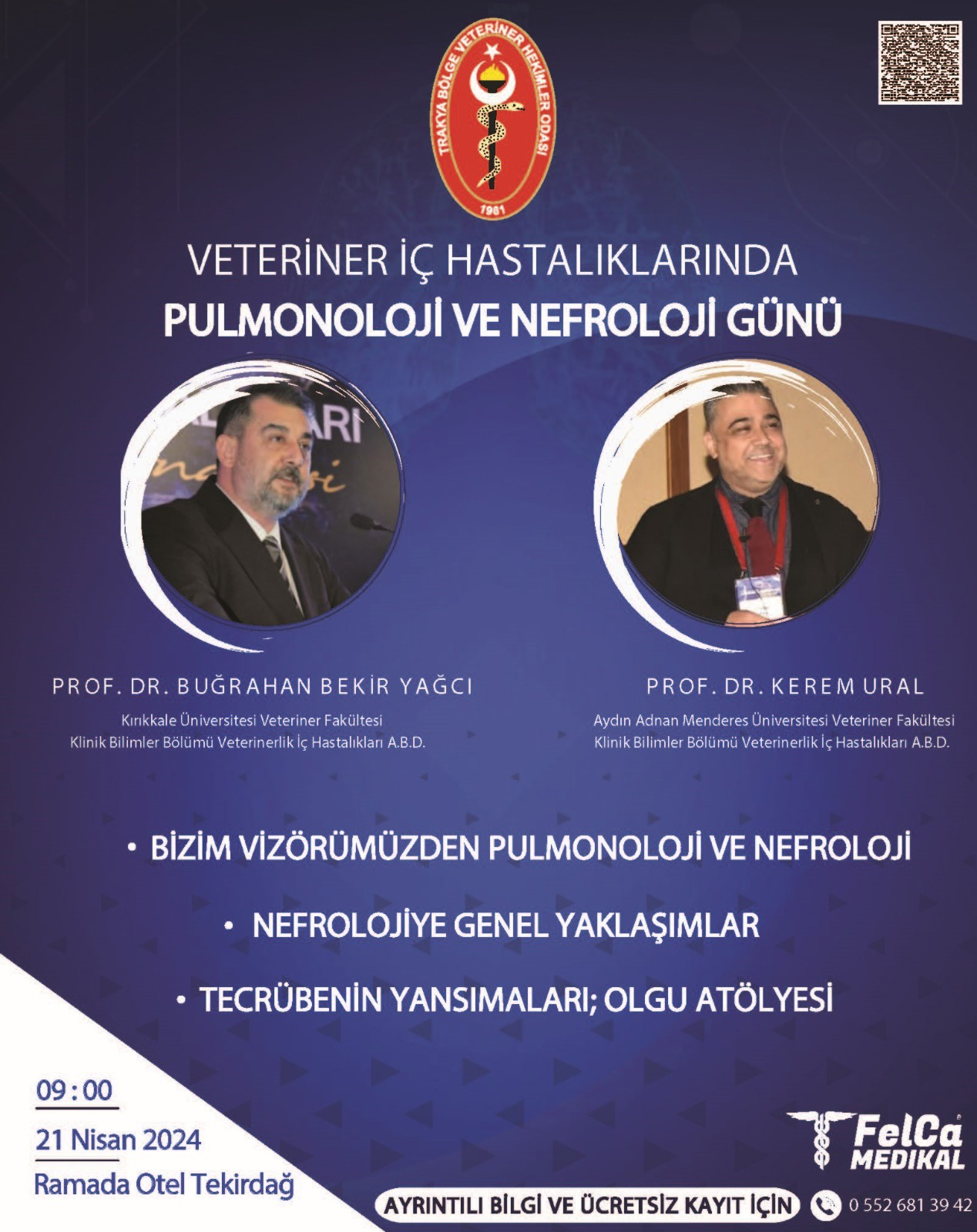 21 апреля 2024 года в турецком городе Текирдаг состоялся ветеринарный семинар, посвященный областям пульмонологии и нефрологии. Мероприятие прошло на площадке отеля Ramada by Wyndham Tekirdag при поддержке Тракийской региональной палаты ветеринаров. В качестве спикеров выступили профессора Буграхан Бекир Ягджи и Керем Урал, обсудившие с участниками лекции некоторые клинические случаи из собственной практики.