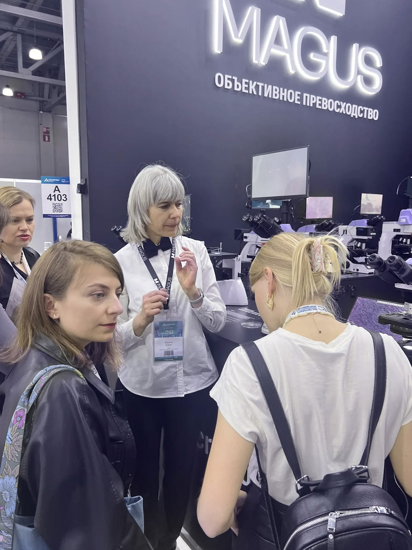 На стенде прошел мастер-класс по применению простой поляризации в отраженном свете – публика осталась в восторге. А те гости, которые направлялись к нам за консультацией по конкретным задачам, получили все необходимые ответы: например, ветеринары, которые жаловались на невозможность разглядеть лептоспироз на своем оборудовании, узнали от экспертов MAGUS сразу о двух готовых решениях для этой задачи.