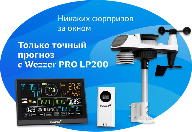 В серии Levenhuk Wezzer PLUS представлены приборы, расширенный функционал которых понравится требовательным пользователям. Это термометры, термогигрометры, метеостанции (в том числе с Wi-Fi) и детекторы углекислого газа. Можно выбрать гаджет с цветным или монохромным ЖК-экраном. Многие из приборов не только оповещают о погоде, но и выполняют функцию стильных настольных часов с будильником и календарем. Определять температуру и влажность воздуха умеют все модели, некоторые также оснащены барометром, дождемером и опцией прогноза погоды. Большинство гаджетов поставляется с 1–3 беспроводными датчиками. Это позволяет охватить большую территорию, контролируя все капризы погоды и изменения микроклимата в помещениях.