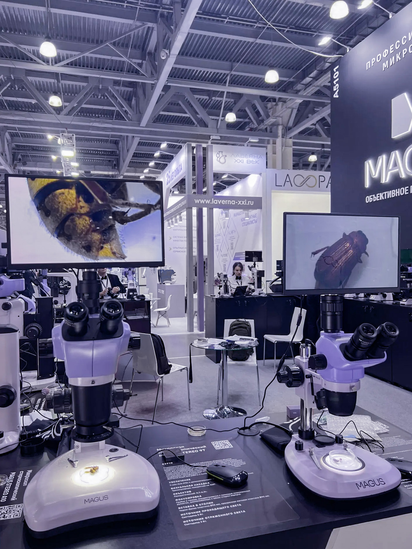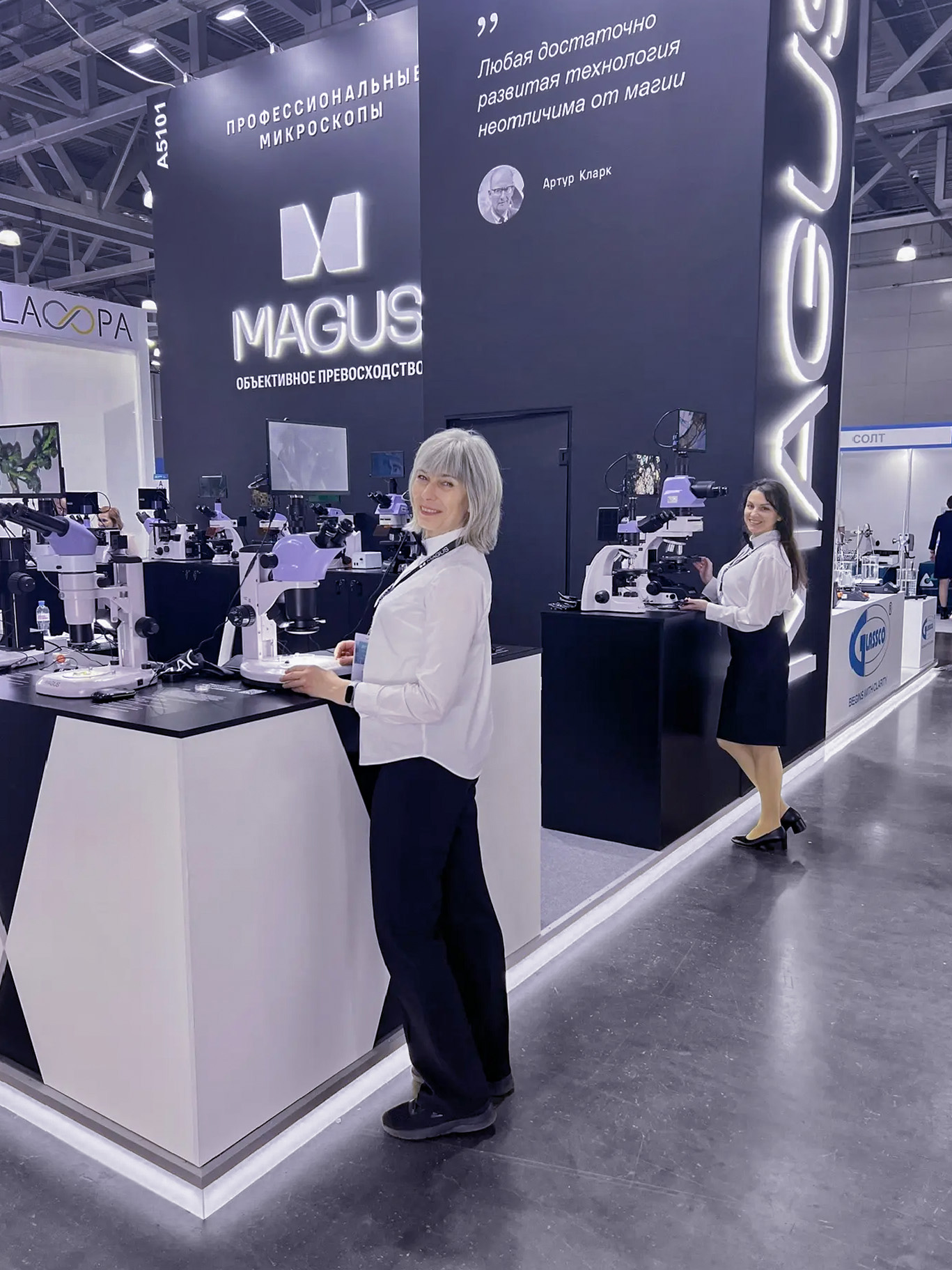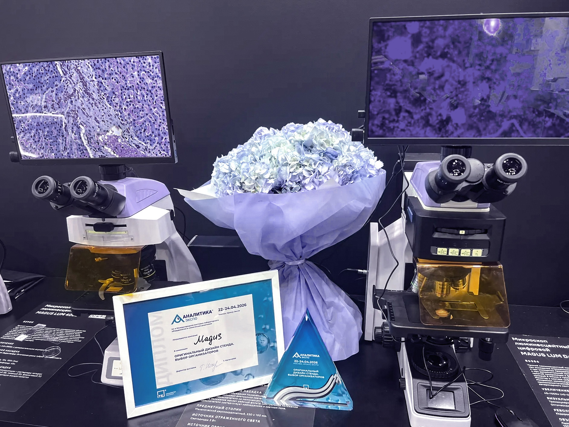 В Москве завершилась выставка «Аналитика Экспо 2026» – мероприятие, посвященное лабораторному оборудованию и химическим реагентам, собравшее под одной крышей более 6 тысяч посетителей. Бренд профессиональных микроскопов MAGUS не только представил свое оборудование на таком масштабном событии, но и получил награду от организаторов в номинации «Оригинальный дизайн стенда» – стильная черно-белая экспозиция запомнилась множеству гостей, а нашей команде был вручен памятный диплом.