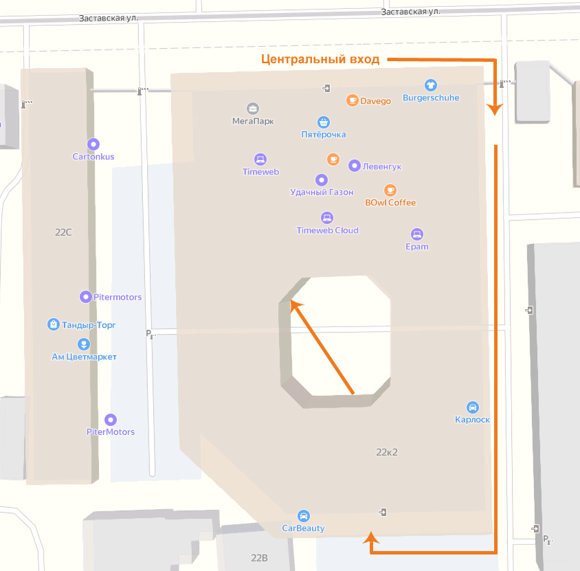 Санкт-Петербург — складское помещение на втором этаже с вывеской Levenhuk, Заставская ул., д. 22, корп. 2, БЦ «МегаПарк», задний фасад здания, въезд на пандус, по рабочим дням с 10:00 до 18:00. Загрузить и распечатать схему проезда в Санкт-Петербурге.