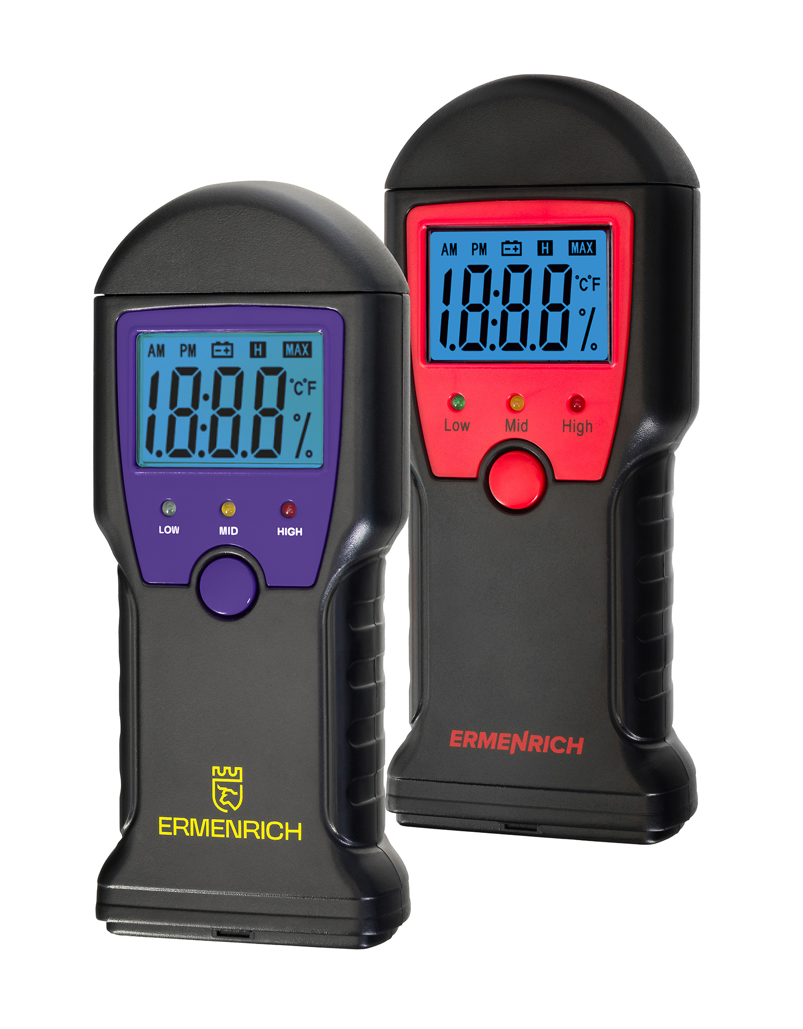 Датчик влажности (влагомер) Ermenrich Wett MW10 – портативный измерительный инструмент, который определяет уровень влажности разных материалов: в первую очередь сделанных из древесины, но также и предназначенных для строительных работ (растворов, смесей и проч.). Он работает по контактной технологии, т. е. имеет пару игольчатых сенсоров, которые и проводят замеры. Также прибор может определять температуру.